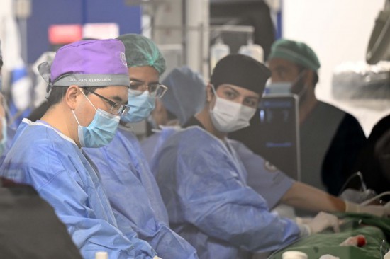 2025年1月23日,在巴基斯坦旁遮普省拉瓦尔品第市,中国医学科学院阜外医院副院长潘湘斌(左一)为一名巴基斯坦先心病儿童做手术。在两天的时间里,潘湘斌率领的援巴先天性心脏病治疗紧急项目专家组,为8名先天性心脏病患儿进行了免费手术。在巴期间,团队还为当地约200名医务人员开展了集中培训。