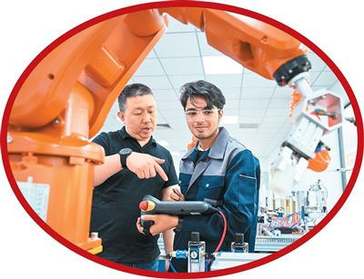 在天津现代职业技术学院鲁班工坊实训教室,教师指导学生操作设备。
