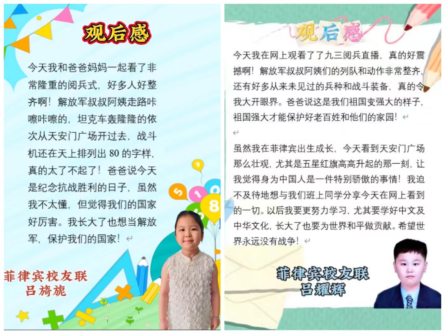 菲律宾校友联营员施雅祺表示,今天隔着屏幕看完了九三阅兵,眼眶湿湿的。今天的中国不再是中文书里黑白照片的沧桑模样,她眉宇间有风雷激荡,步履中有山河回响。这份骄傲不需要翻译,却永远能穿透所有距离与隔阂。当战机划过湛蓝的天幕,我在评论区打下:“此生幸拥炎黄血,来生愿在种花家。”——这或许就是海外华裔最真挚的告白,此刻耳边依然回荡着“正义必胜、和平必胜、人民必胜”!愿祖籍国繁荣昌盛,国泰民安!营员蔡瀚文表示,我们要谨记牢记初心、不负使命、守护和平、捍卫正义。作为海外华裔青少年,我们虽然身在异国他乡,但祖国的历史,我们将永远铭记。我们爱您,伟大的祖国。我们爱您,英雄的人民。