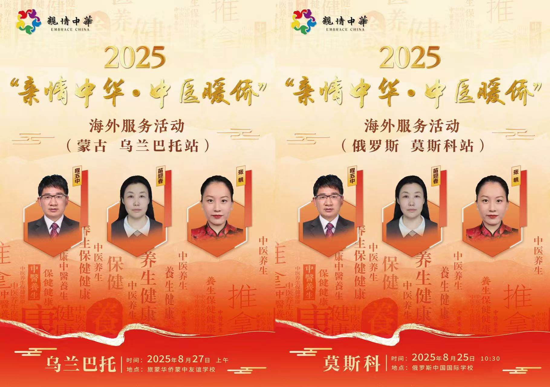 8月23日至28日,与北京市侨联联合组派中医专家团,先后赴俄罗斯莫斯科和蒙古国乌兰巴托开展“亲情中华·中医暖侨”海外服务活动,广泛凝聚侨心侨力。