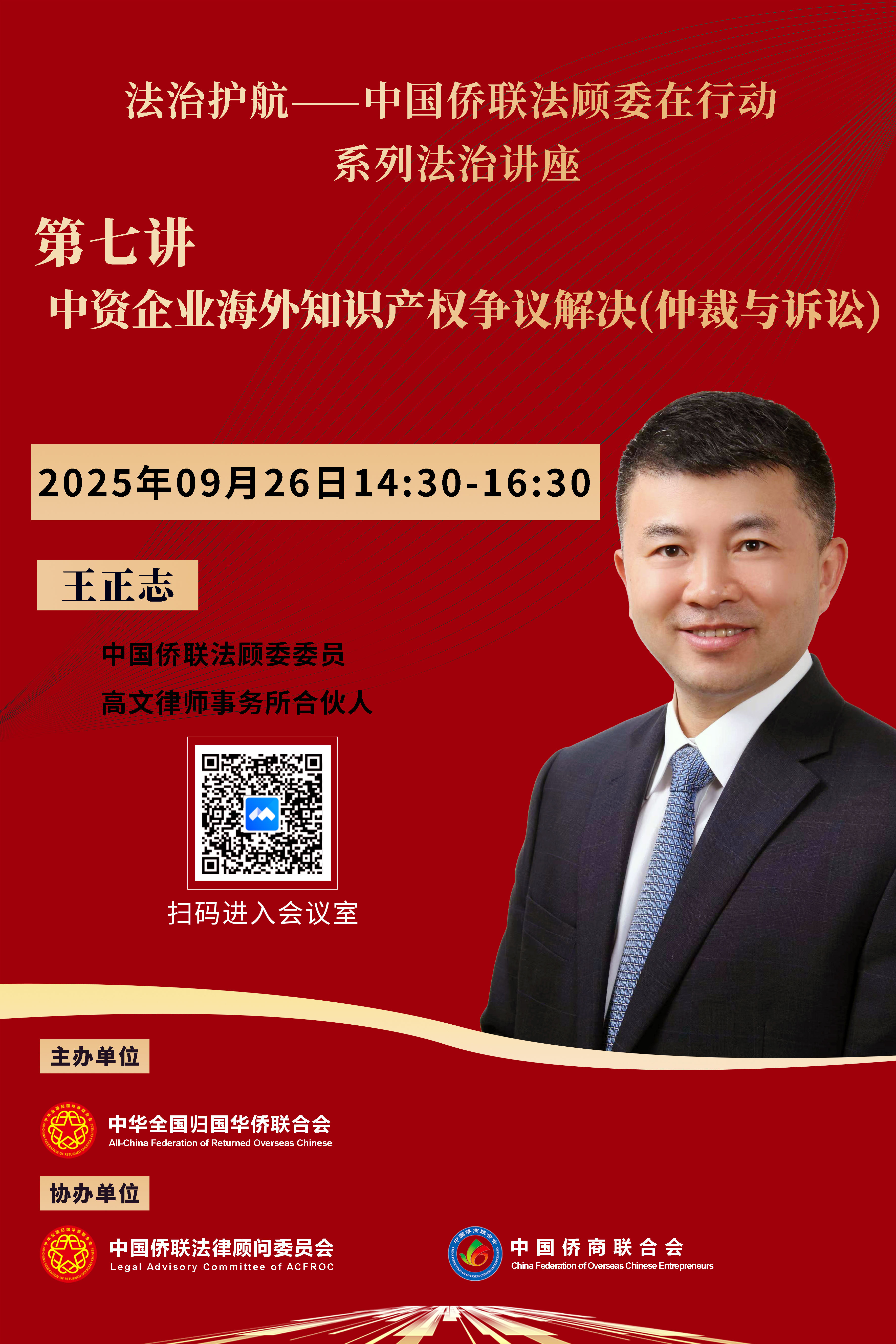第七讲将于9月26日(周五)14:30开播,由法顾委国际贸易与仲裁专委会委员、高文律师事务所合伙人王正志律师主讲,题目是《中资企业海外知识产权争议解决(仲裁与诉讼)》。听课链接参见下方海报。