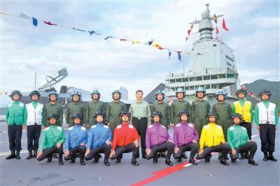 11月5日,我国第一艘电磁弹射型航空母舰福建舰入列授旗仪式在海南三亚某军港举行。中共中央总书记、国家主席、中央军委主席习近平出席入列授旗仪式并登舰视察。这是习近平同舰载机飞行员、航空保障人员合影留念。