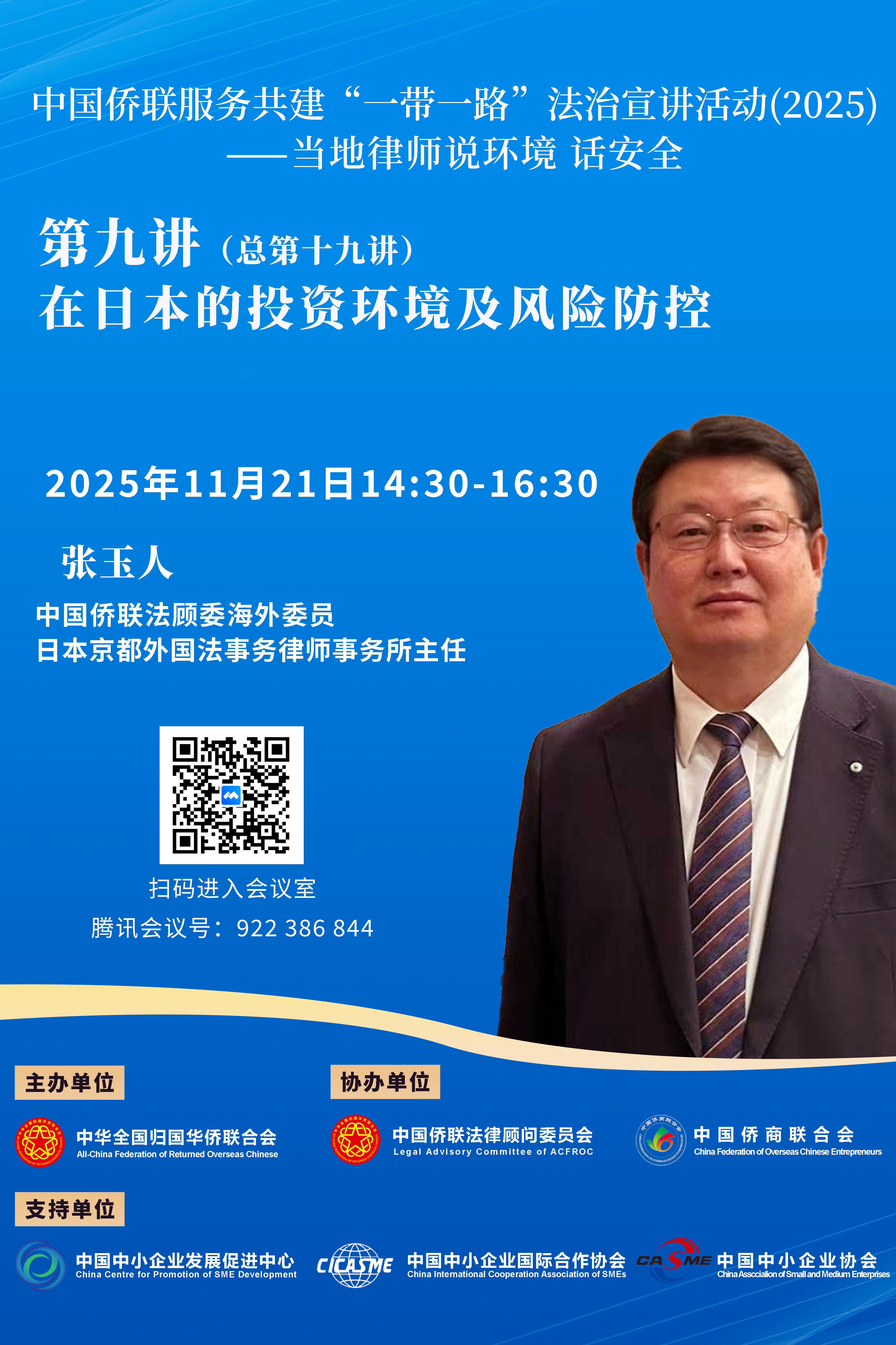 今年第九讲(总第十九讲)将于2025年11月21日(周五)14:30开播,由法顾委海外委员日本张玉人律师主讲。张律师毕业于日本国神奈川大学,获得法学硕士学位,曾在日本L&J律师事务所执业多年,于2010年10月成立了京都外国法事务律师事务所,并担任律师事务所主任。张律师具有中国律师资格和日本外国法事务律师资格,具有深厚的中日法律知识功底和执业经验,从事涉外法律工作24年以来,处理了知识产权、劳动纠纷、工伤事故、交通事故、医疗事故、国际婚姻纠纷等法律问题。张律师还担任最高人民法院中华司法研究会理事、全日本华人促进中国和平统一协会执行会长、在日中国律师联合会创始副会长等职务,并于2021年8月起,在网上免费开办法律讲座,向在日华侨华人宣传中日法律知识,深受好评。